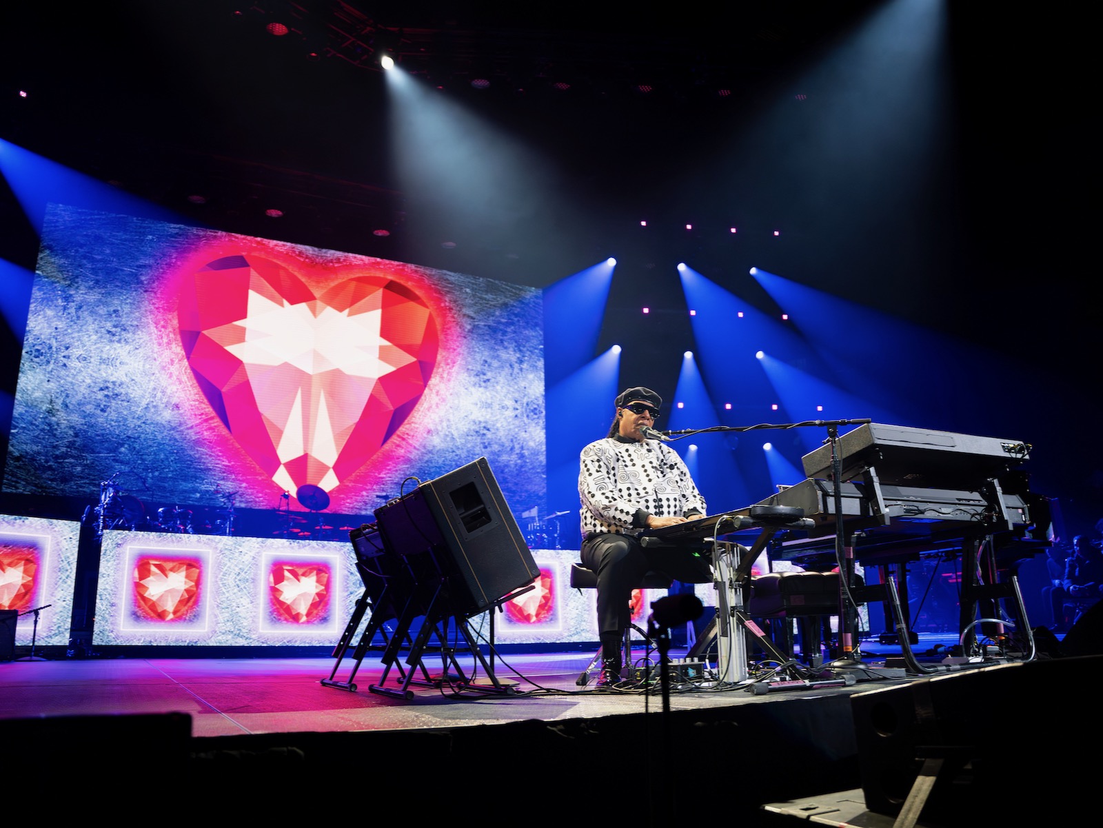 Wonder’s band encompassed a 12-piece string section, six backing vocalists, a five-piece horn ensemble, two percussionists, two guitarists, two keyboard players and one drummer, bass player, guest singer, conductor and, of course, the man himself. Oh, and two of his grandchildren.